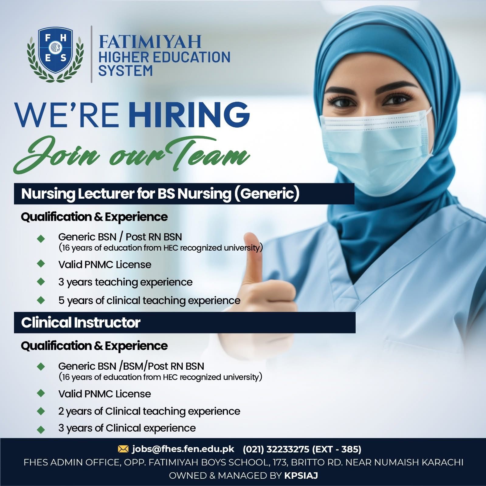 Admissions are announced officially. Applicants may apply online via the FHES website or submit forms directly at the campus.